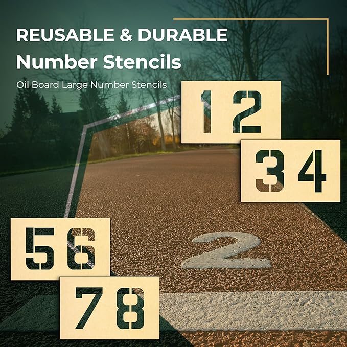 - REUSABLE HEAVY-DUTY OILBOARD – These reusable stencils for painting are made from heavy-duty oilboard, allowing you to reuse them multiple times for pavement paint projects or parking lot paint stencils. The reusable stencil set ensures durability, saving you money while maintaining clean, professional stencil numbers.
