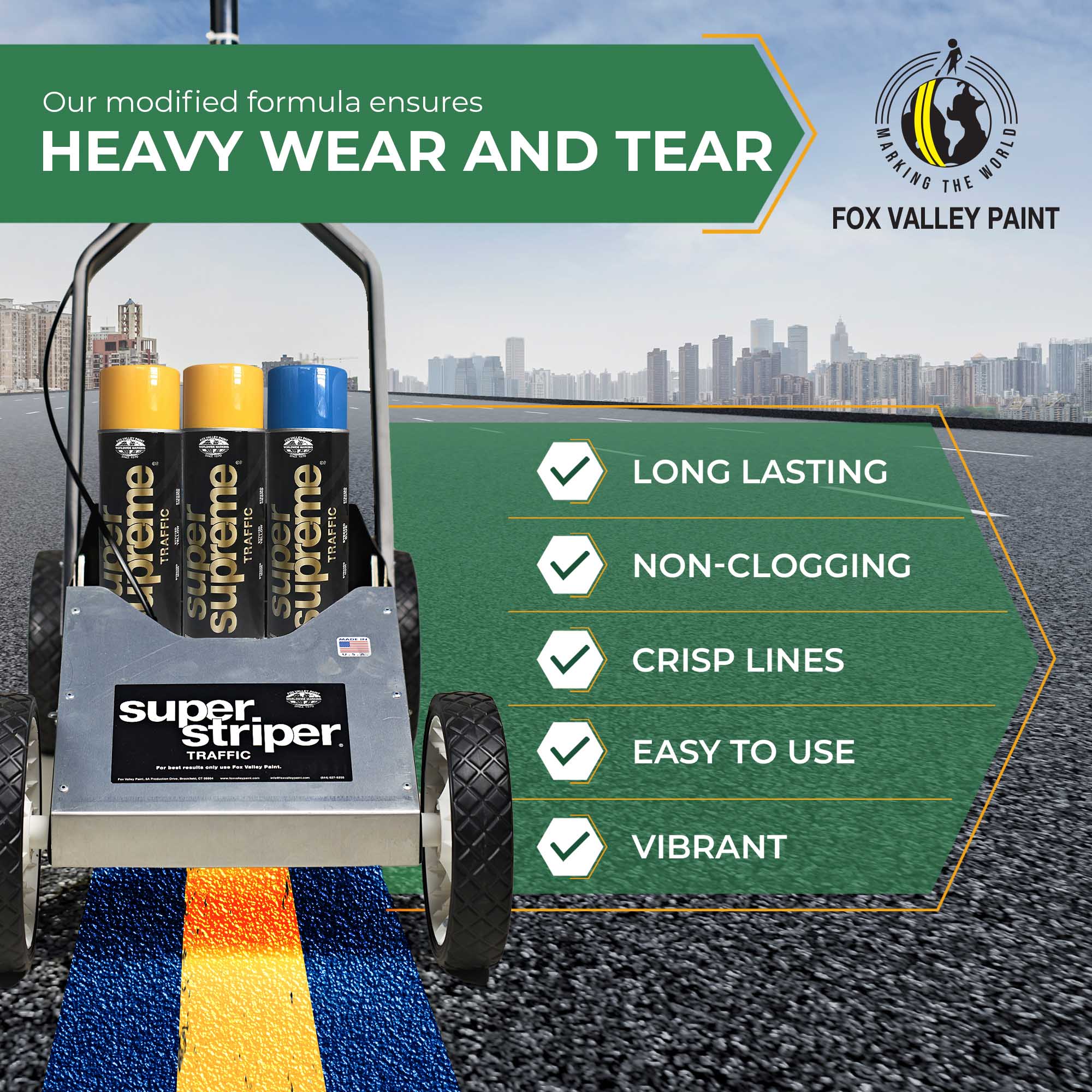Get crisp, professional parking lot lines without hiring a contractor. This all-in-one kit includes Fox Valley’s Super Striper line striping machine and your choice of 6 or 12 cans of Super Supreme traffic marking paint; fast-drying, weather-resistant, and long-lasting on asphalt and concrete.